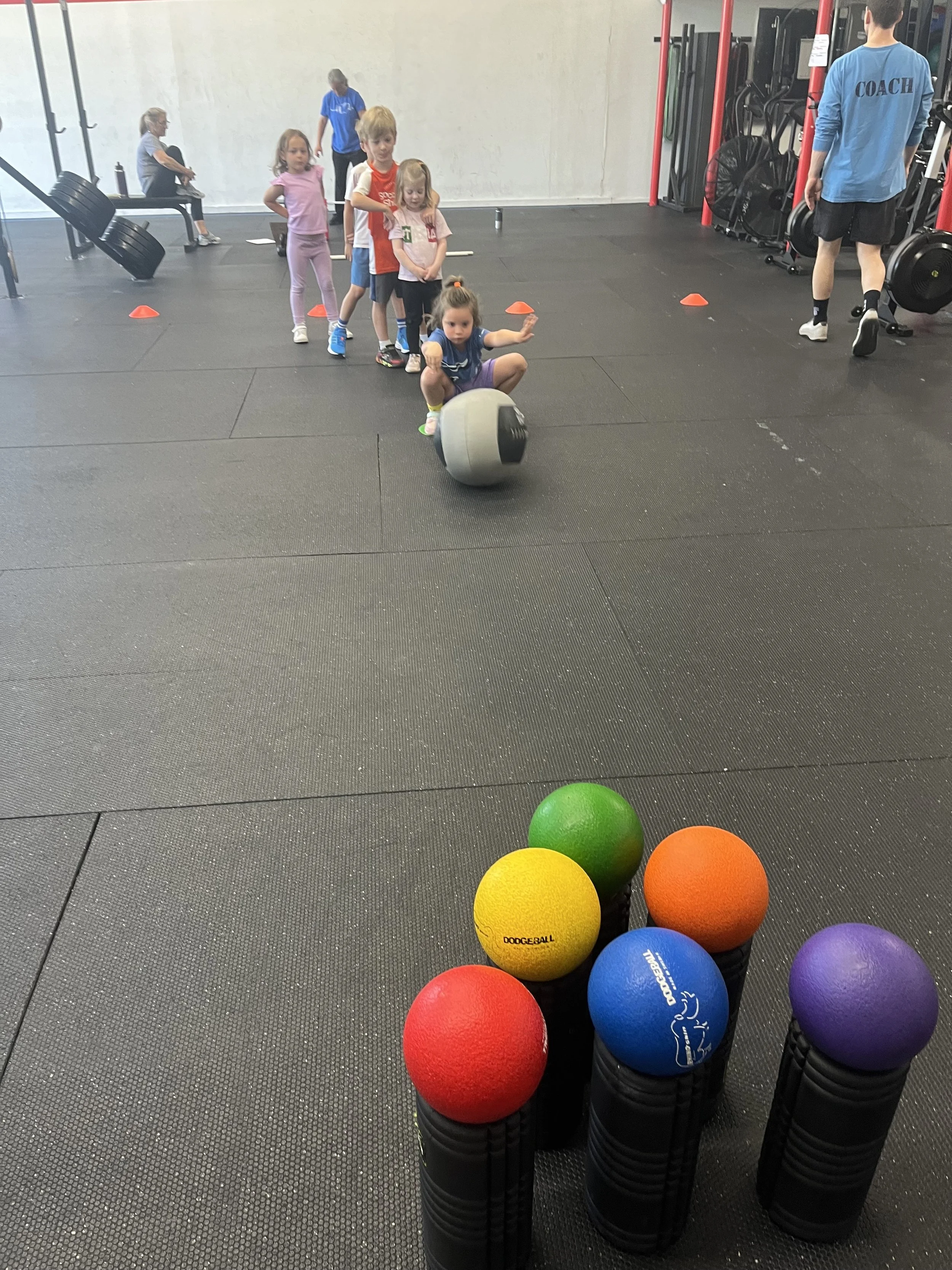Our kids program is taught by a CrossFit Kids-certified coach, and focuses on fun! We learn movements such as the squat, box jumps, and others through games, obstacle courses and other and age-appropriate activities. No weights are used. During the summer, our kids program is held in PCF’s backyard, and is the same time as an adult all-level CrossFit class (which is inside the gym), so children and their parents can workout simultaneously.